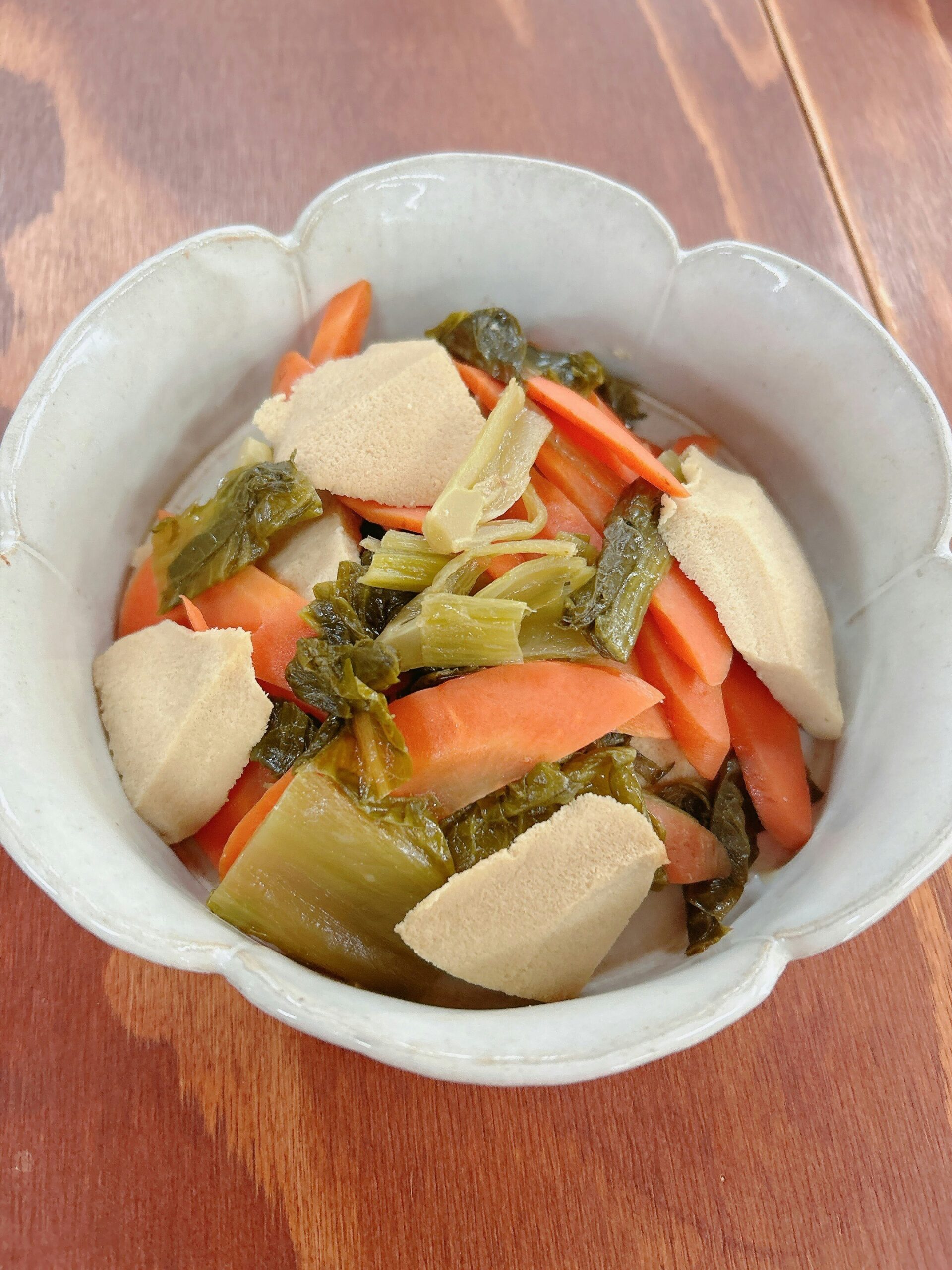 ↑しみじみ美味しい!高菜漬けと高野豆腐の煮物